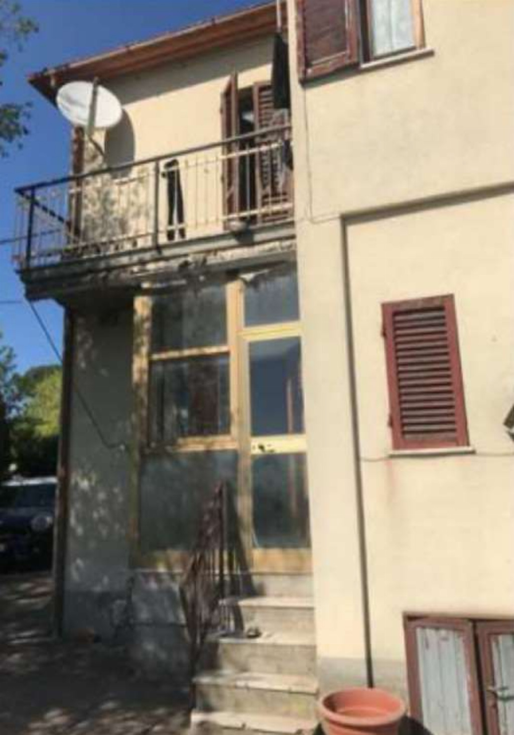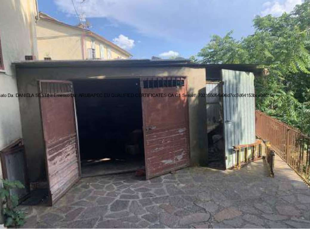 Piena proprietà di fabbricato per civile abitazione costituito da due piani fuori terra comprendente una unità immobiliare residenziale al piano terra con accesso dal resede e una unità immobiliare residenziale al piano primo con accesso da scala esterna, collegate tra loro tramite una scala interna priva di titolo autorizzativo, nonché garage, legnaia e resede. L’unità immobiliare residenziale al piano terra è composta da ingresso/soggiorno, ingresso sul retro, cucina, disimpegno, camera, antibagno e servizio igienico. Superficie lorda totale mq. 83,50 circa. L’unità immobiliare residenziale al piano primo è composta da ingresso/disimpegno, locale pluriuso, cucina/angolo cottura, soggiorno, camera e servizio igienico. Superficie lorda totale mq. 76,50 circa.